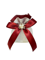 Offrez à vos invités un souvenir inoubliable avec ce sac à dragées raffiné, sublimé par un ruban bordeaux intense , un tissu légèrement scintillant et un bijou central orné de perles et de strass . Chaque détail a été pensé pour incarner le raffinement, la noblesse et la fête .